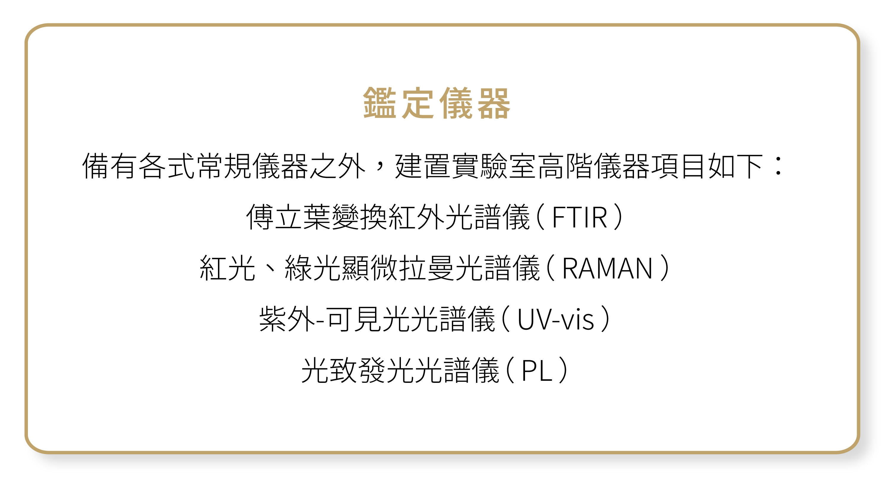 紅寶石、藍寶石、祖母綠等五大寶石品種鑑定、產地判別及優化處理偵測。