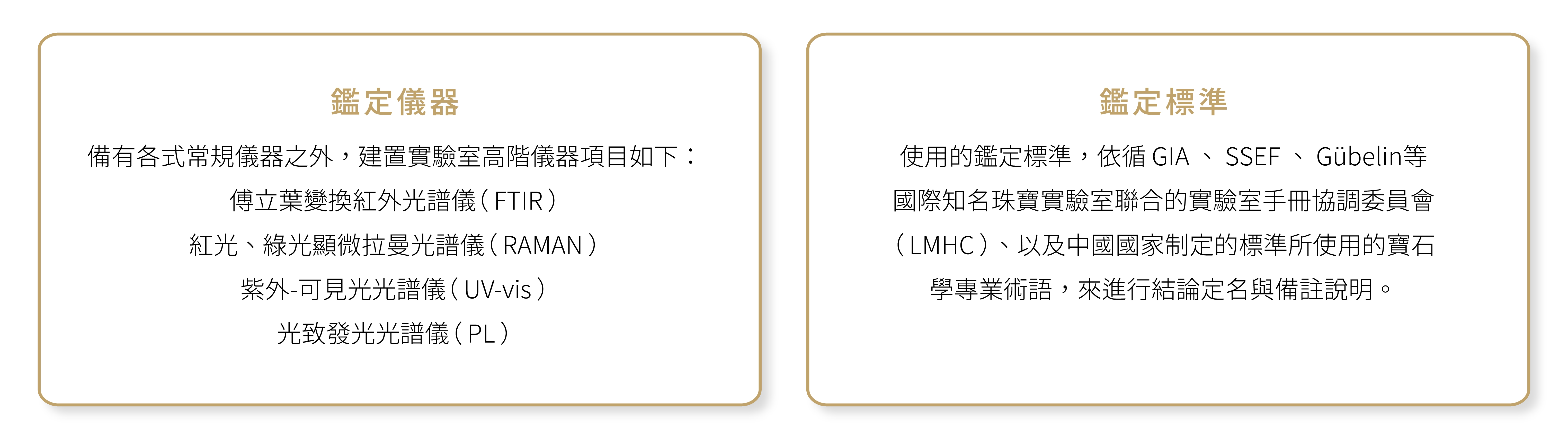 包含天然鑽石分級(4C評估)、培育鑽石(Lab-Grown)辨識、螢光反應檢測。